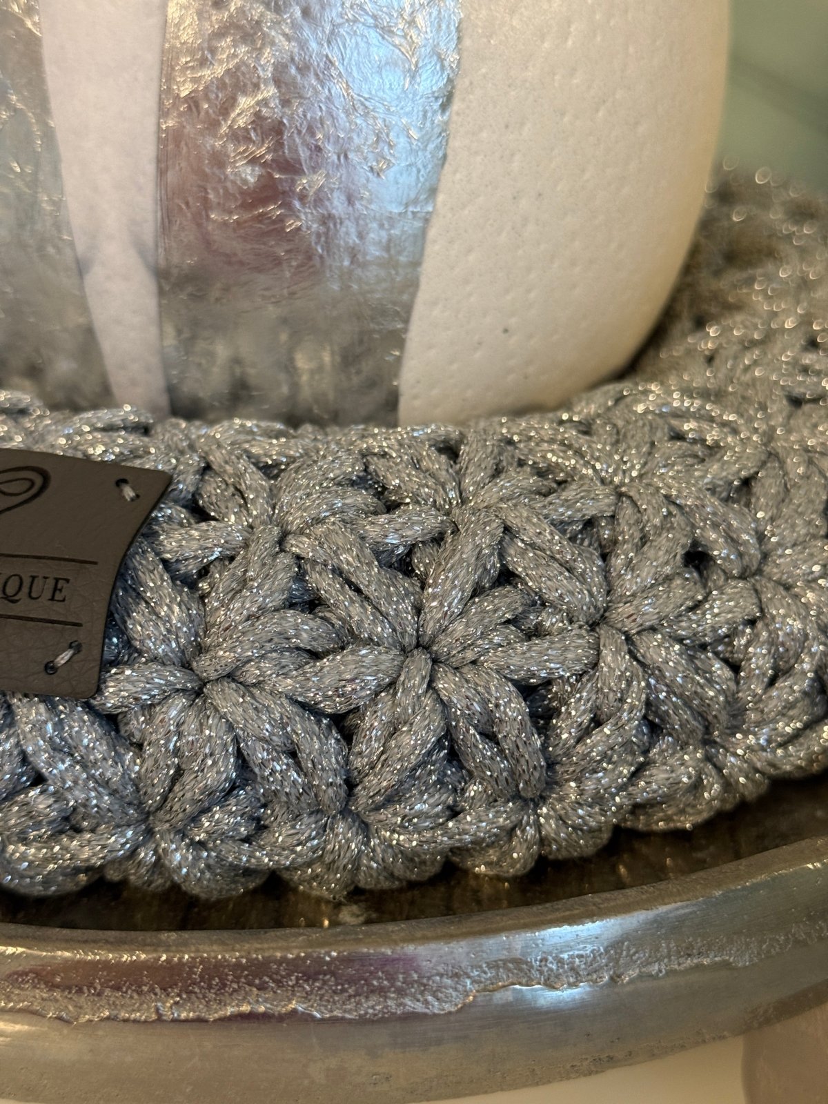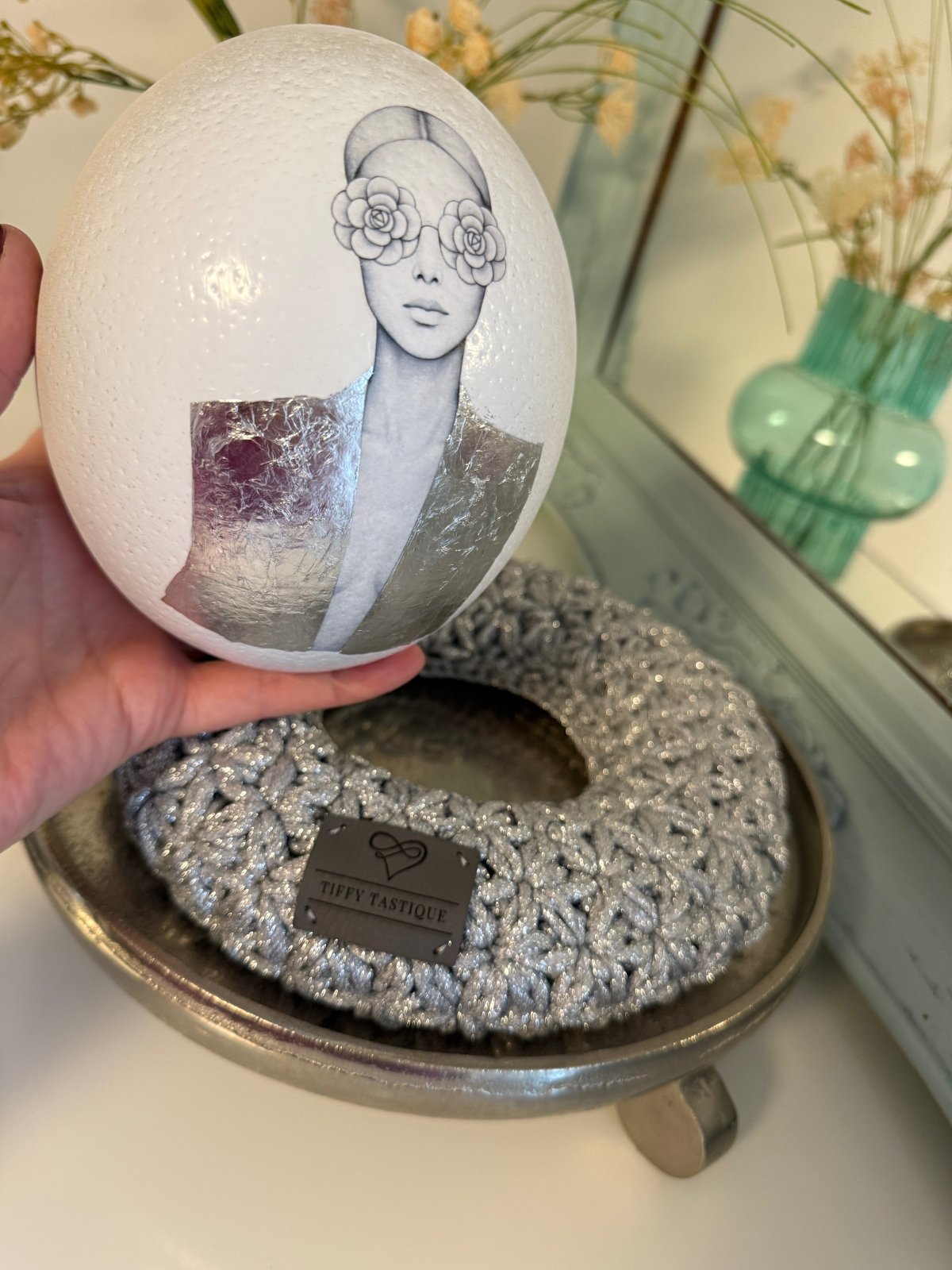 Der handgehäkelte Kranz von Tiffy Tastique mit sanftem Schimmer bringt das Ei perfekt zur Geltung: besonders, glänzend, luxuriös.
