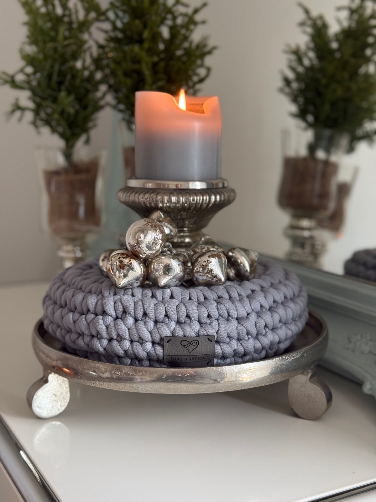 Der silbergraue Häkelkranz ist ein Glanzstück für sich: grob und trotzdem edel, wie geschaffen für Bauernsilber x Ave Glitzeria Look.