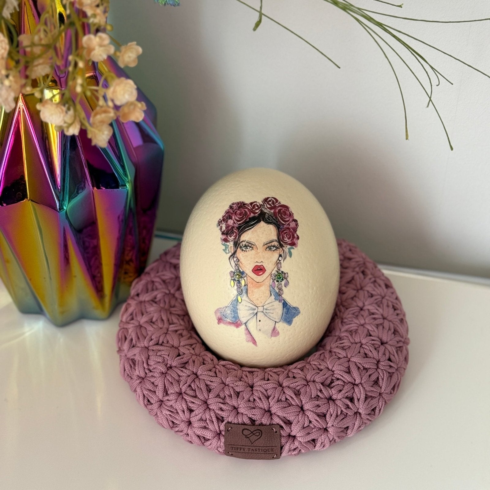 Der handgehäkelte Signature-Kranz von Tiffy Tastique in zartem Altrosa setzt das Ei perfekt in Szene, wie ein Couture-Kragen aus Garn.