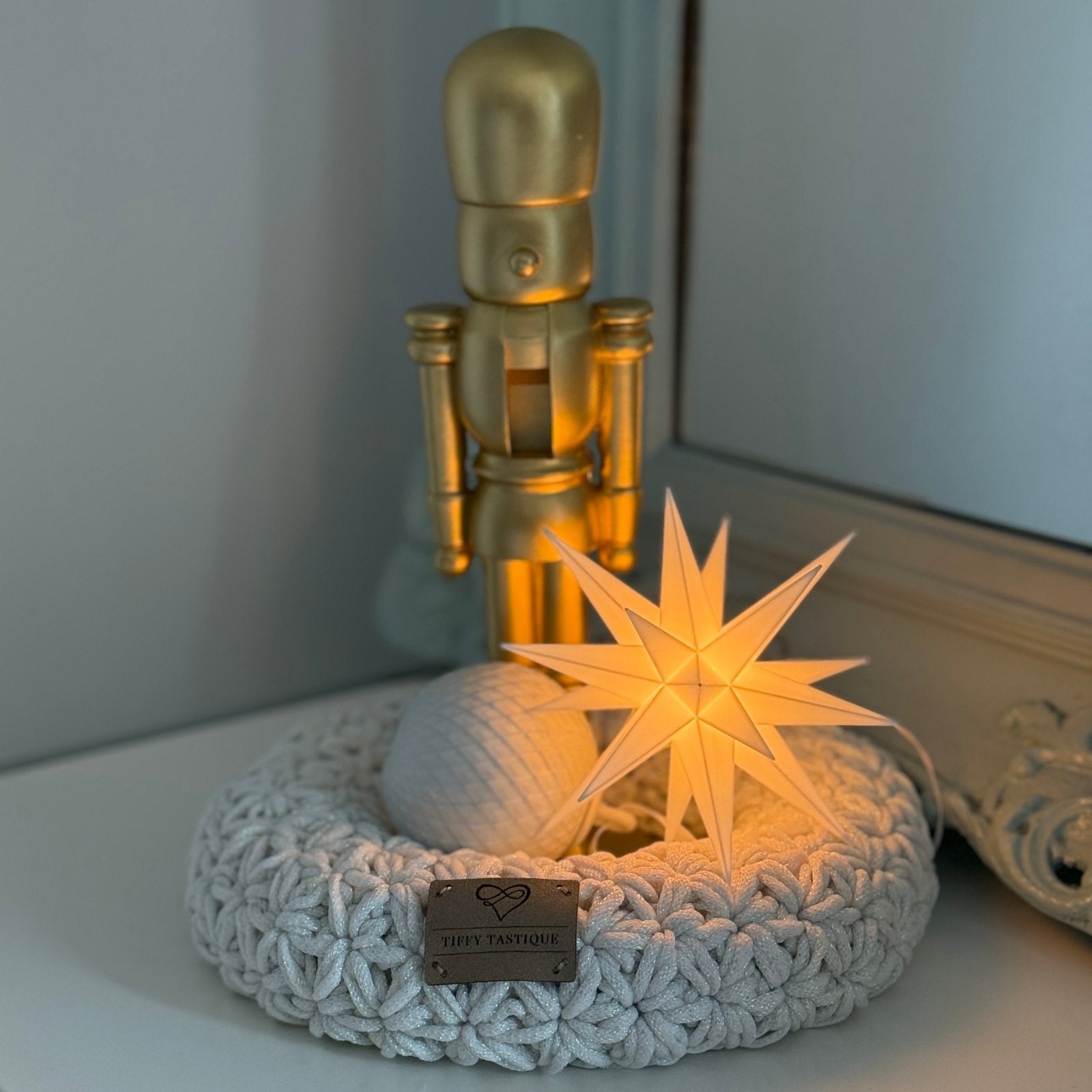 – Handgehäkelter Kranz von Tiffy Tastique mit sanftem Schimmer