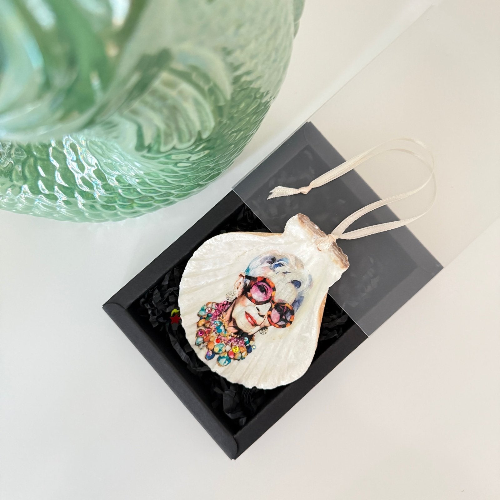 Handveredeltes Deko - Objekt: Coastal Charm „Iris Iconic", echter Muschelanhänger mit Preciosa® veredelt von ei - nzigartig