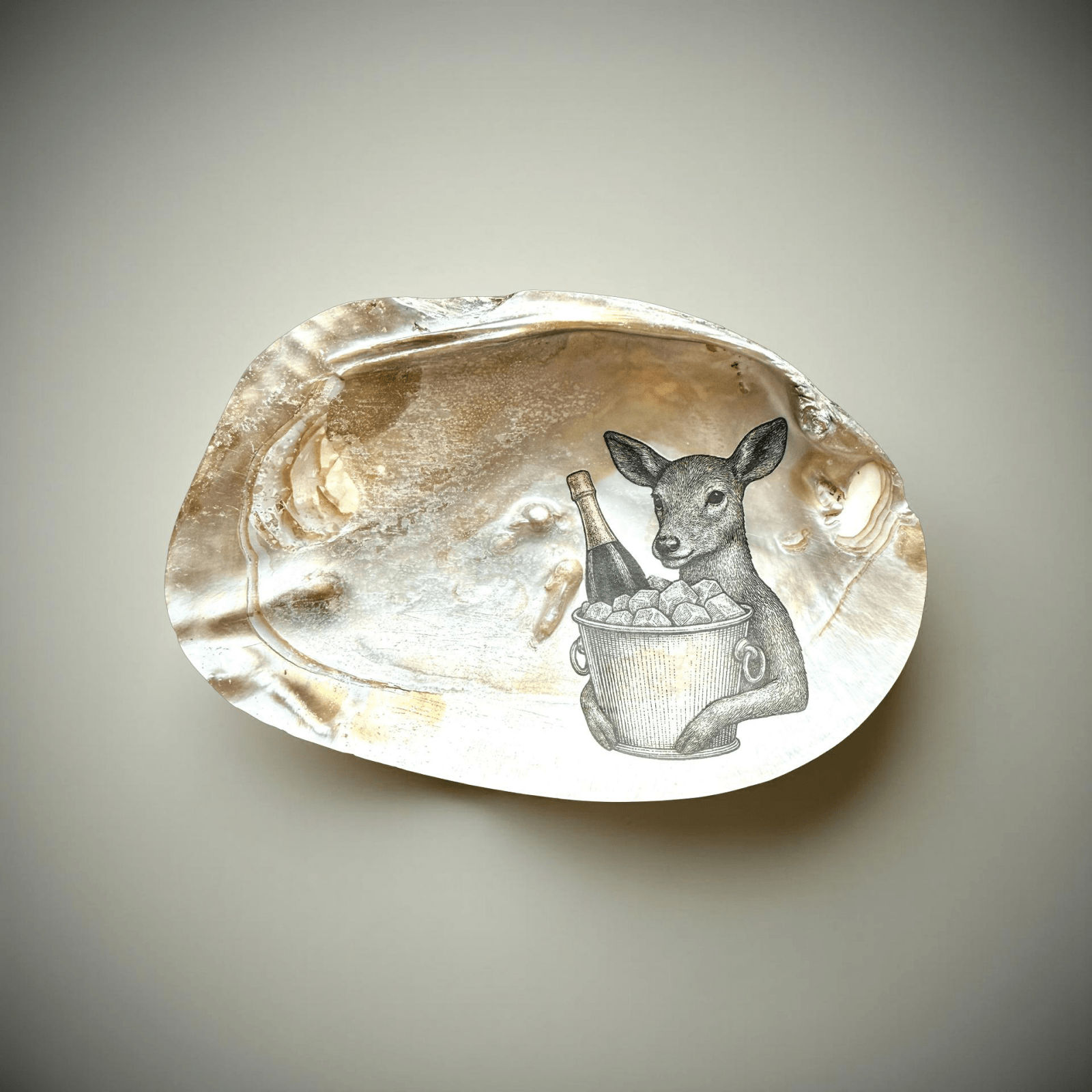 Ein Reh hält einen Silberkühler mit Champagnerflasche.
