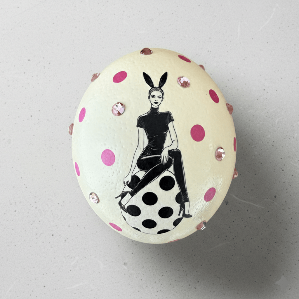 Ein echtes Straußenei, ringsum veredelt mit pinken Polka Dots und Preciosa Kristallen.