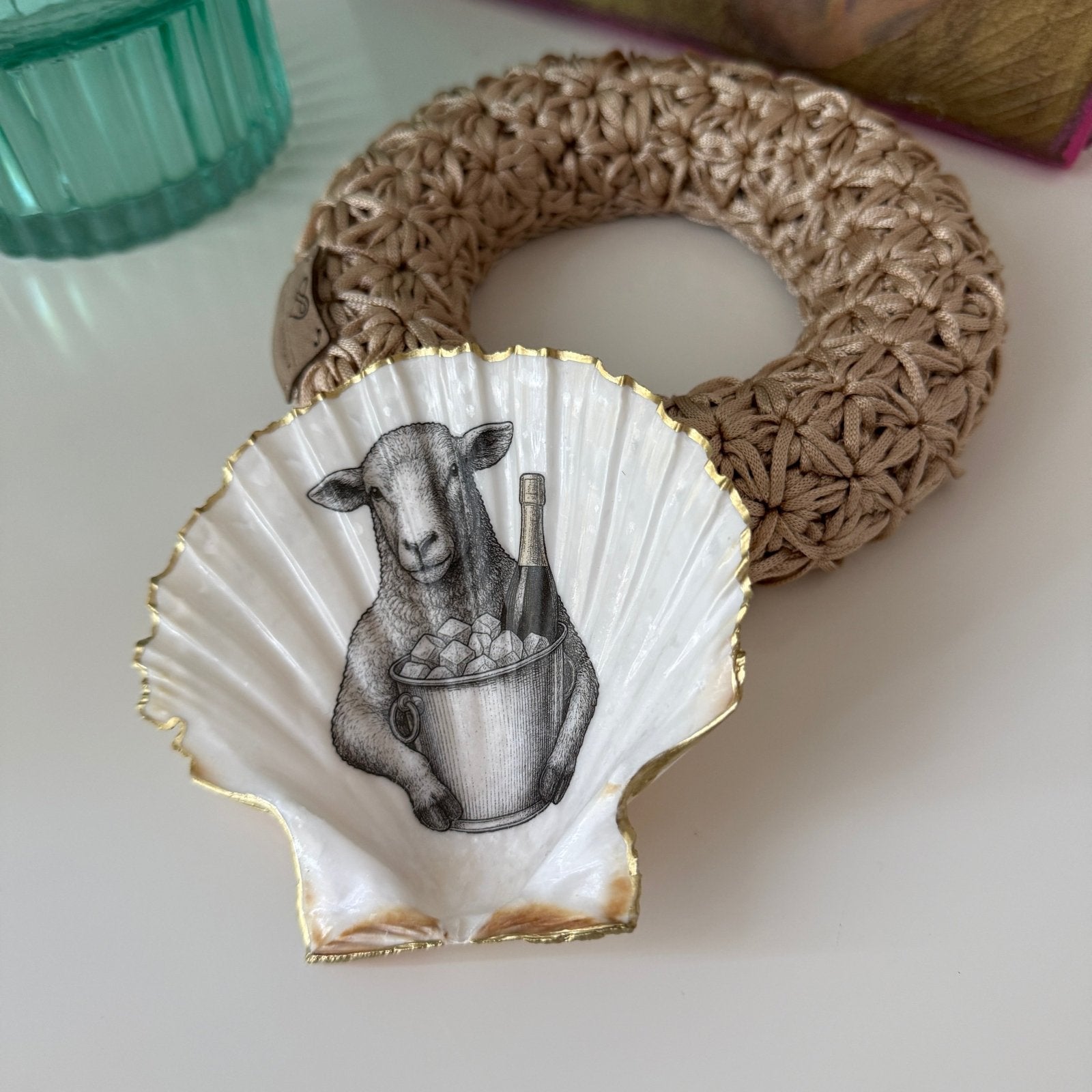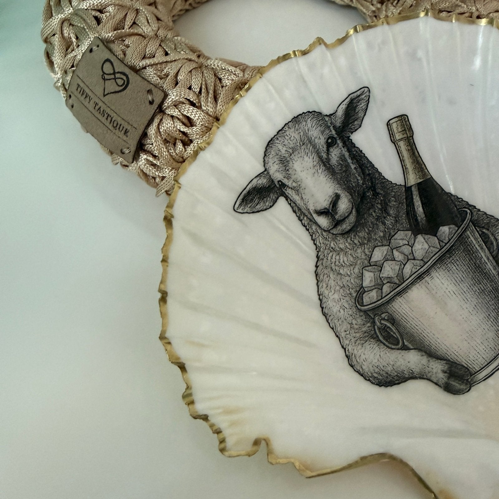 Ein Schaf hält einen Silberkühler mit Champagnerflasche.
