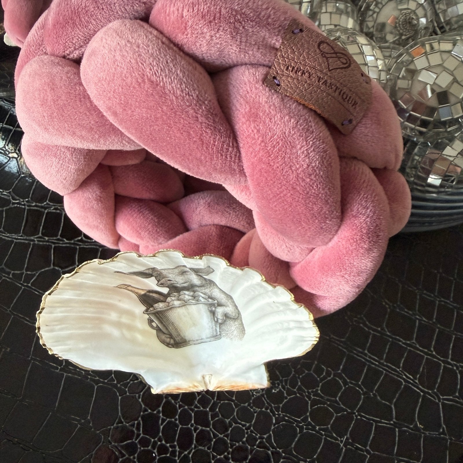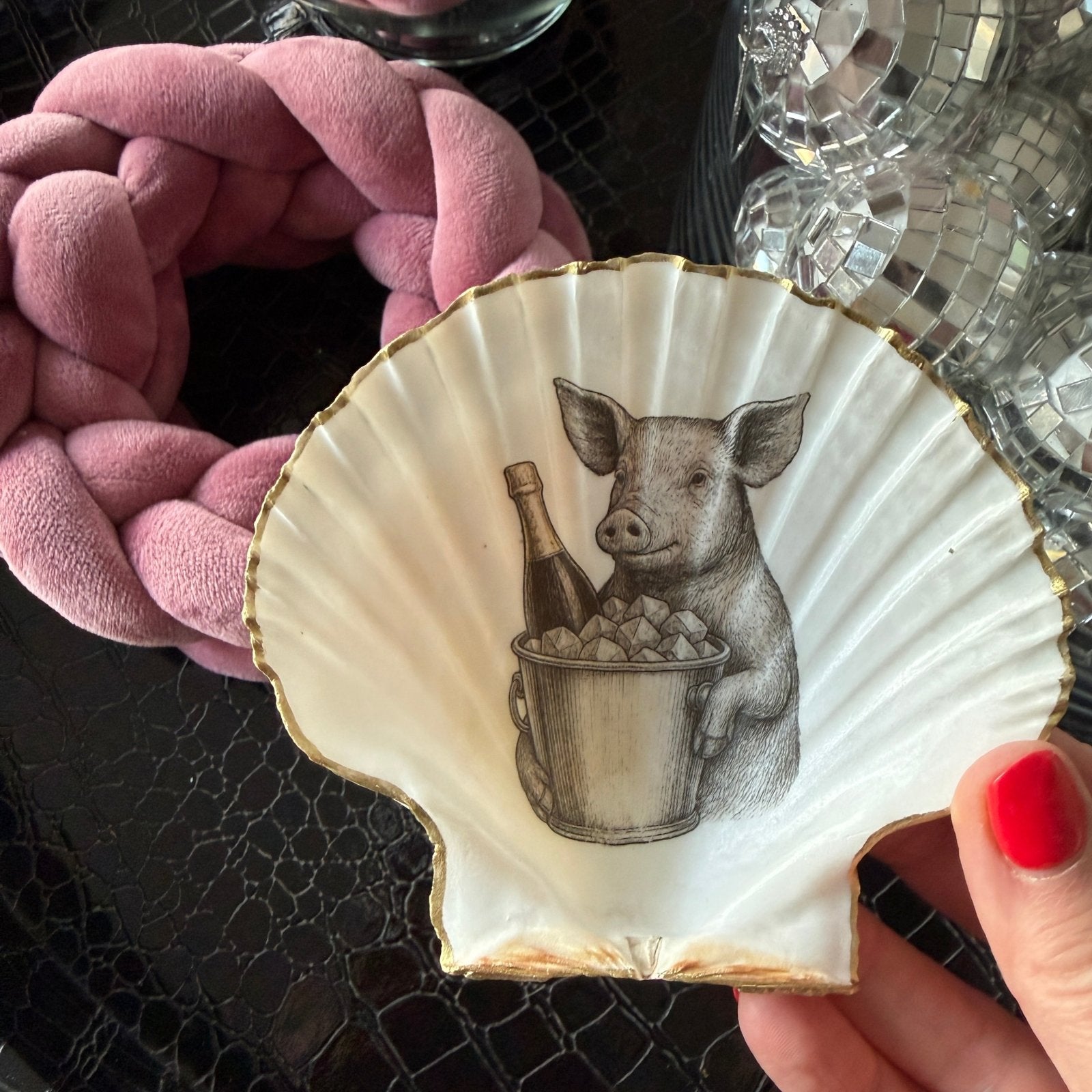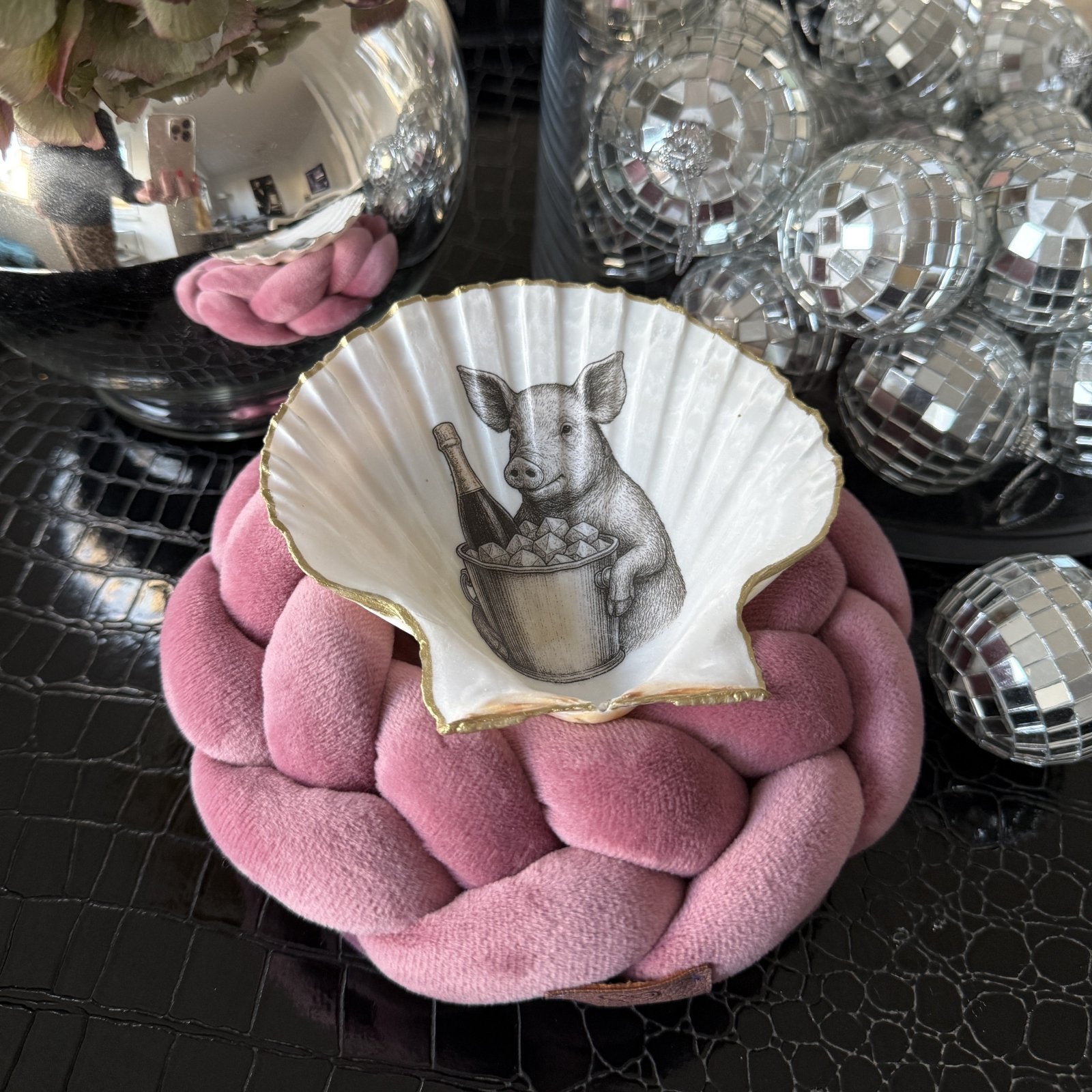Dekoschale "Das Perlmutt-Schwein", inkl. Strick-Kranz von Tiffy Tastique