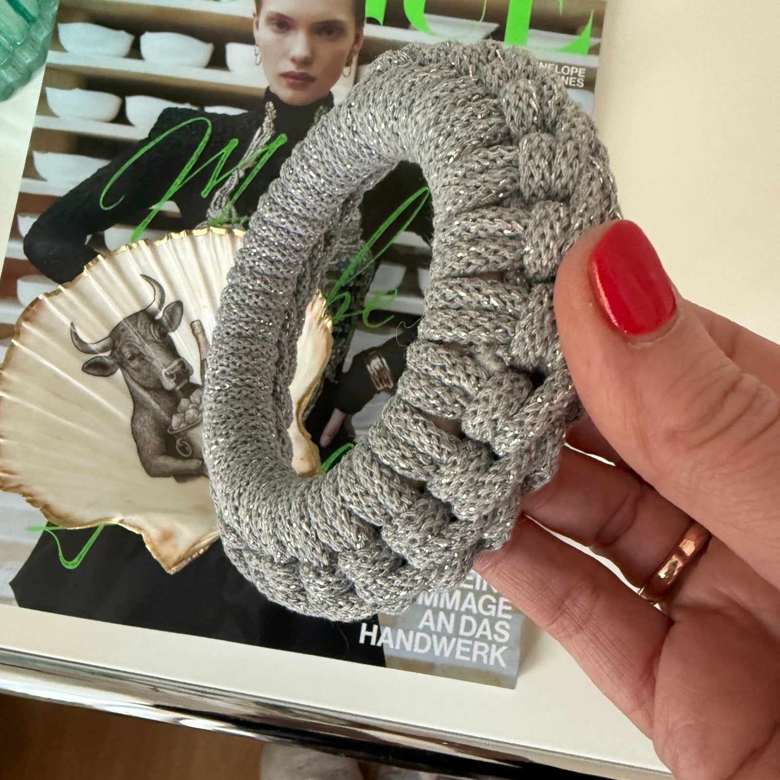 Häkelring: Lurexgarn in Silbergrau und Silberfäden, Holzreif umhäkelt mit den Cirka-Maßen: 12cm Außenmaß I 7cm Innenmaß I 2cm Höhe