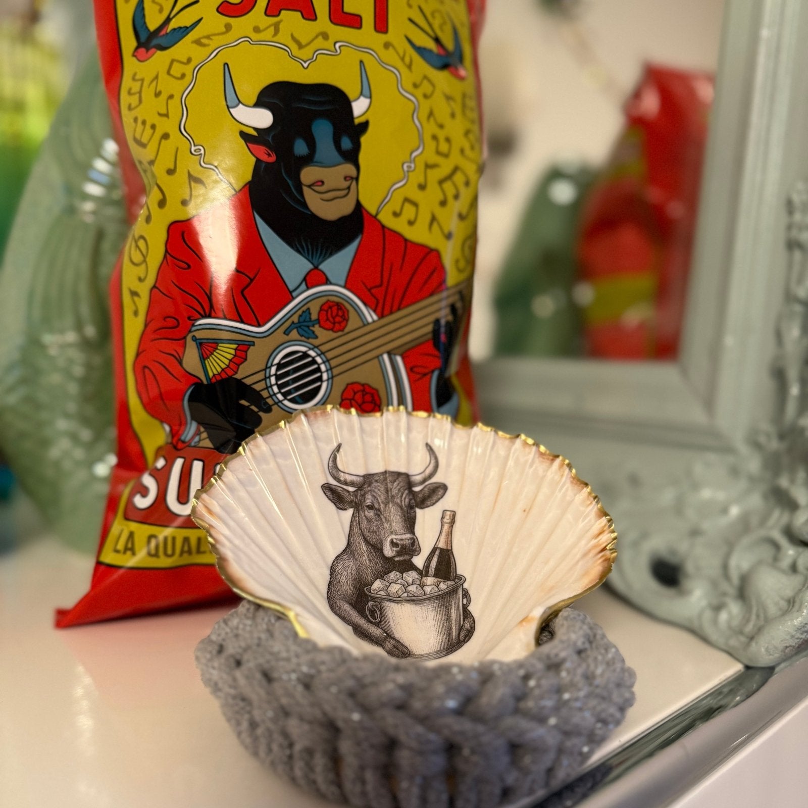 Dekoschale "Der Perlmutt-Stier", inkl. „Häkel-Ring von Tiffy Tastique