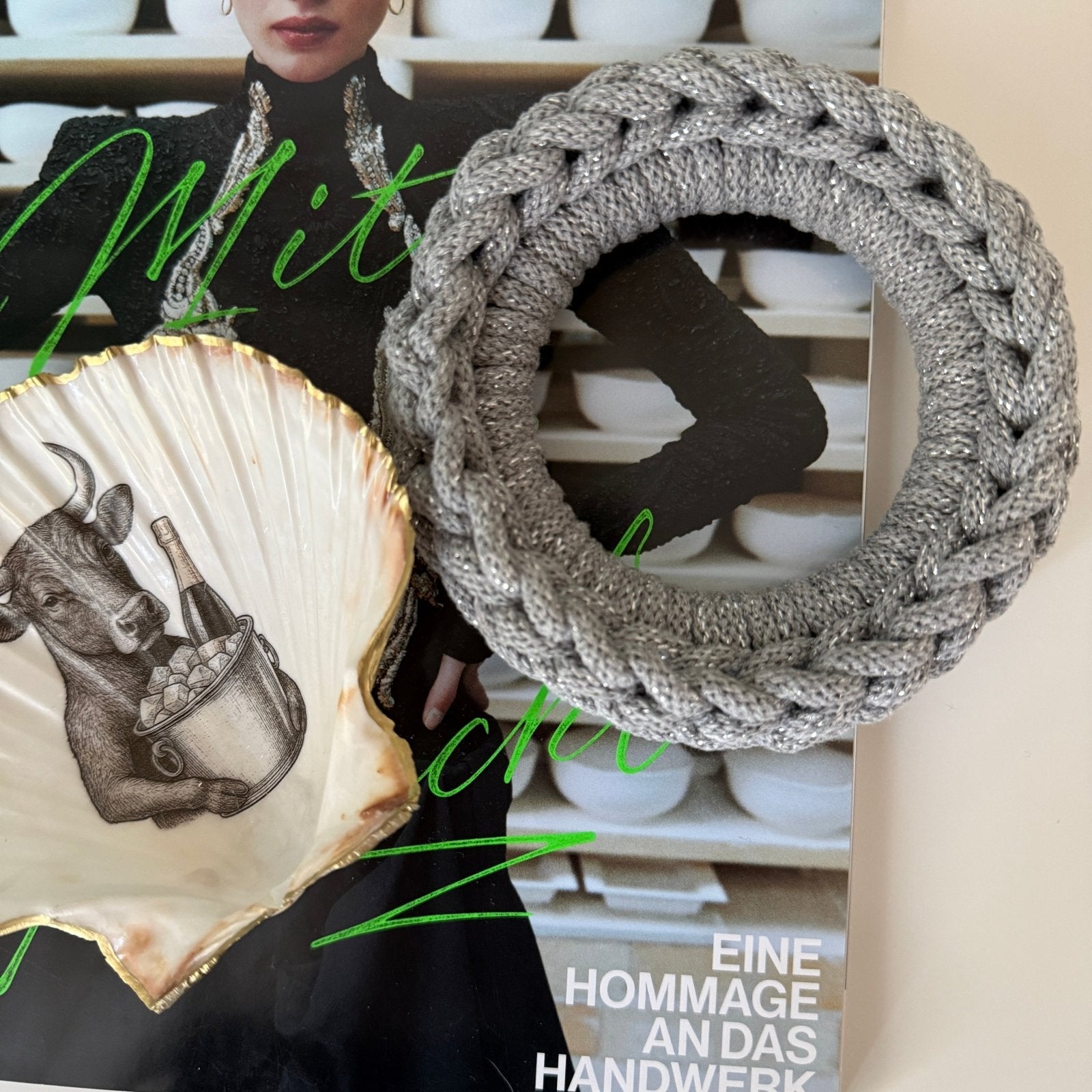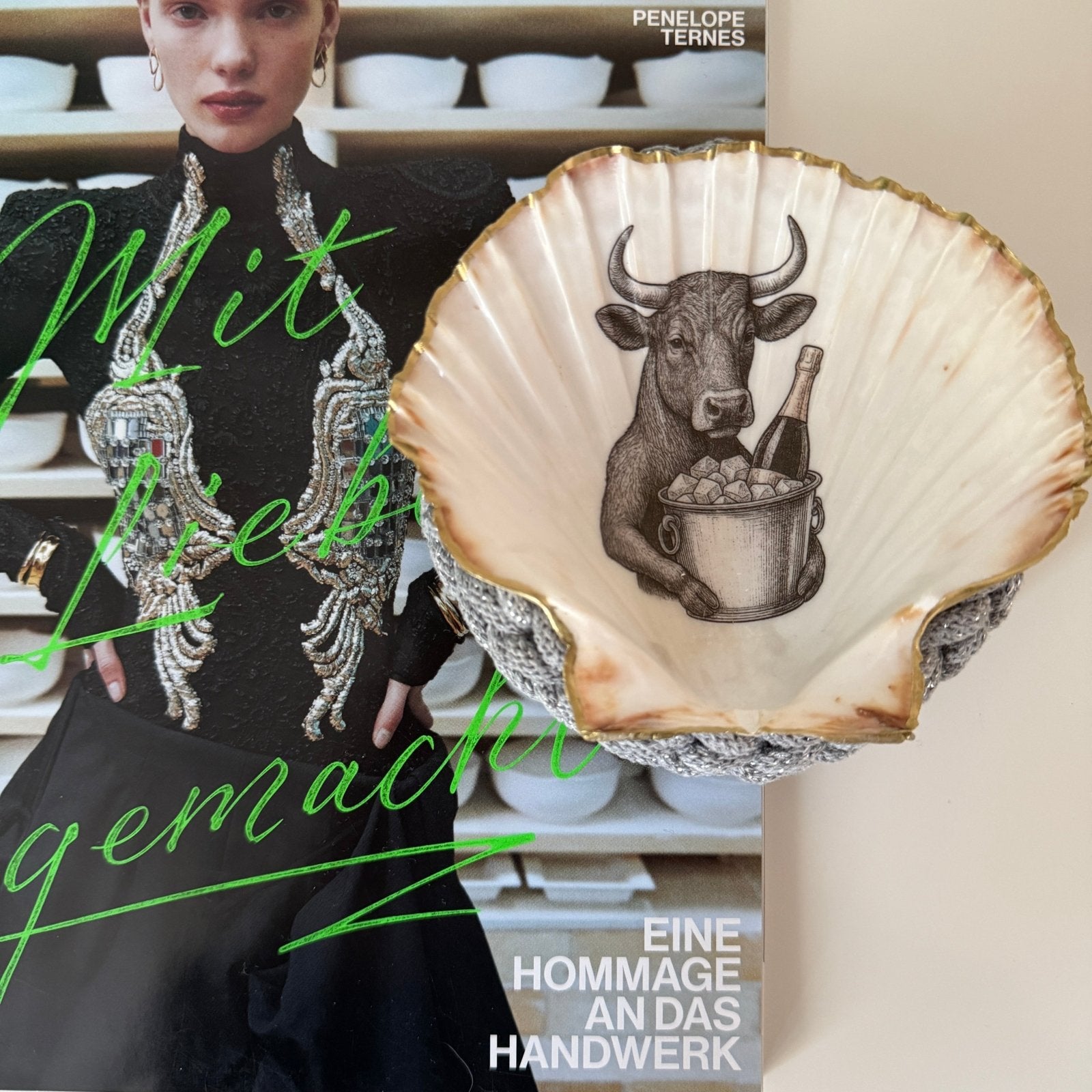 Handveredeltes Deko - Objekt: Dekoschale "Das Perlmutt - Stier", inkl. „Häkel - Ring von Tiffy Tastique von ei - nzigartig Bild-Lightbox öffnen