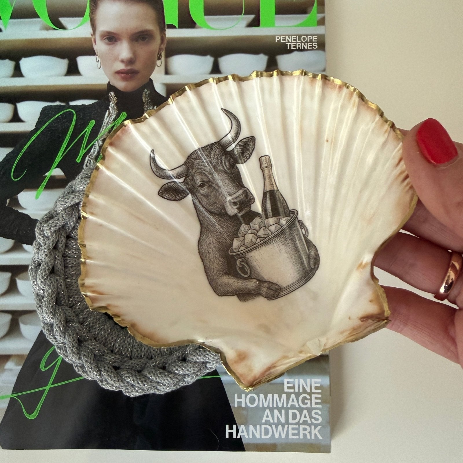 Handveredeltes Deko - Objekt: Dekoschale "Der Perlmutt - Stier", echte Fächermuschel mit Metallic - Kante von ei - nzigartig