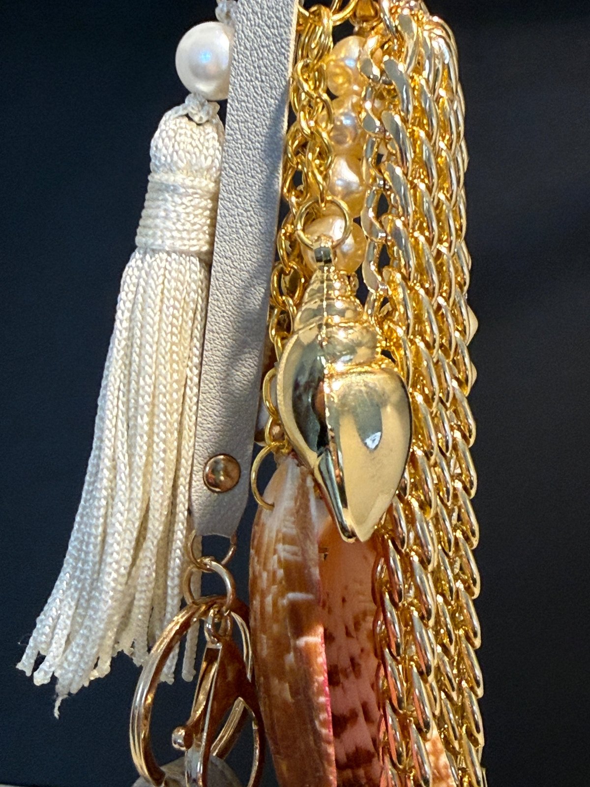 Naturmuschel, Perlen, Metallkette, Kunstleder-Mini-Bag, Satinquaste.