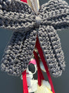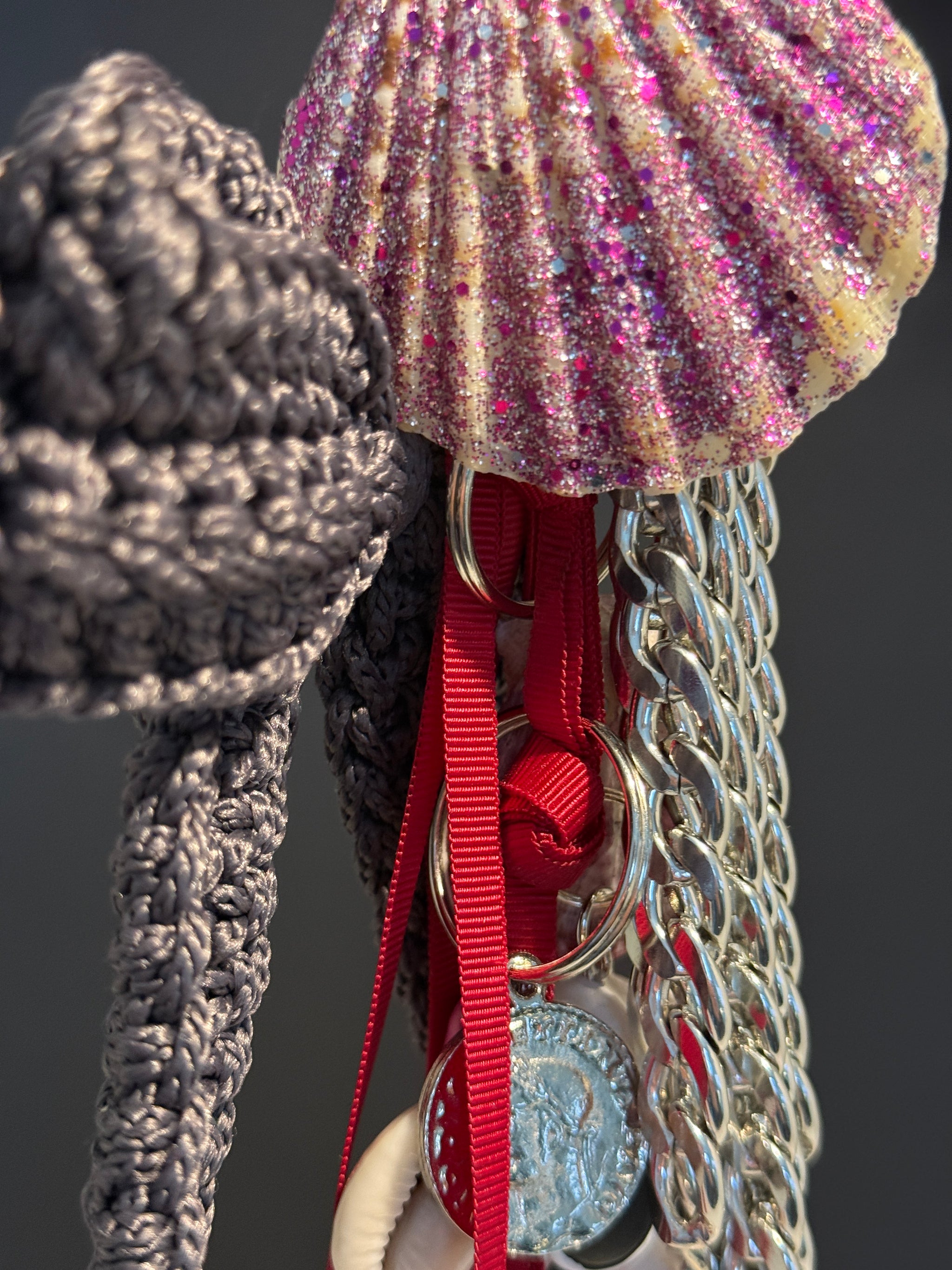 Häkelwerk, Ripsband, Naturmuscheln, Mini-Figur, Metallkette.